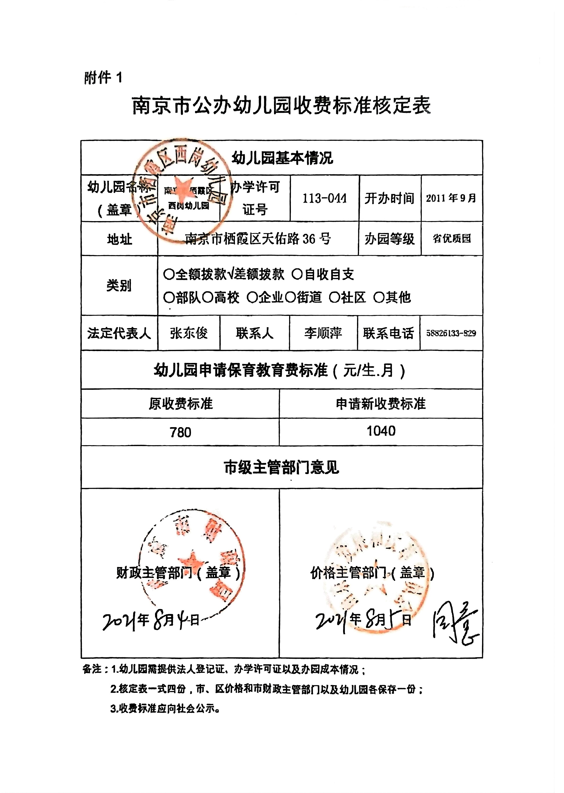 南京市栖霞区西岗幼儿园收费告家长书