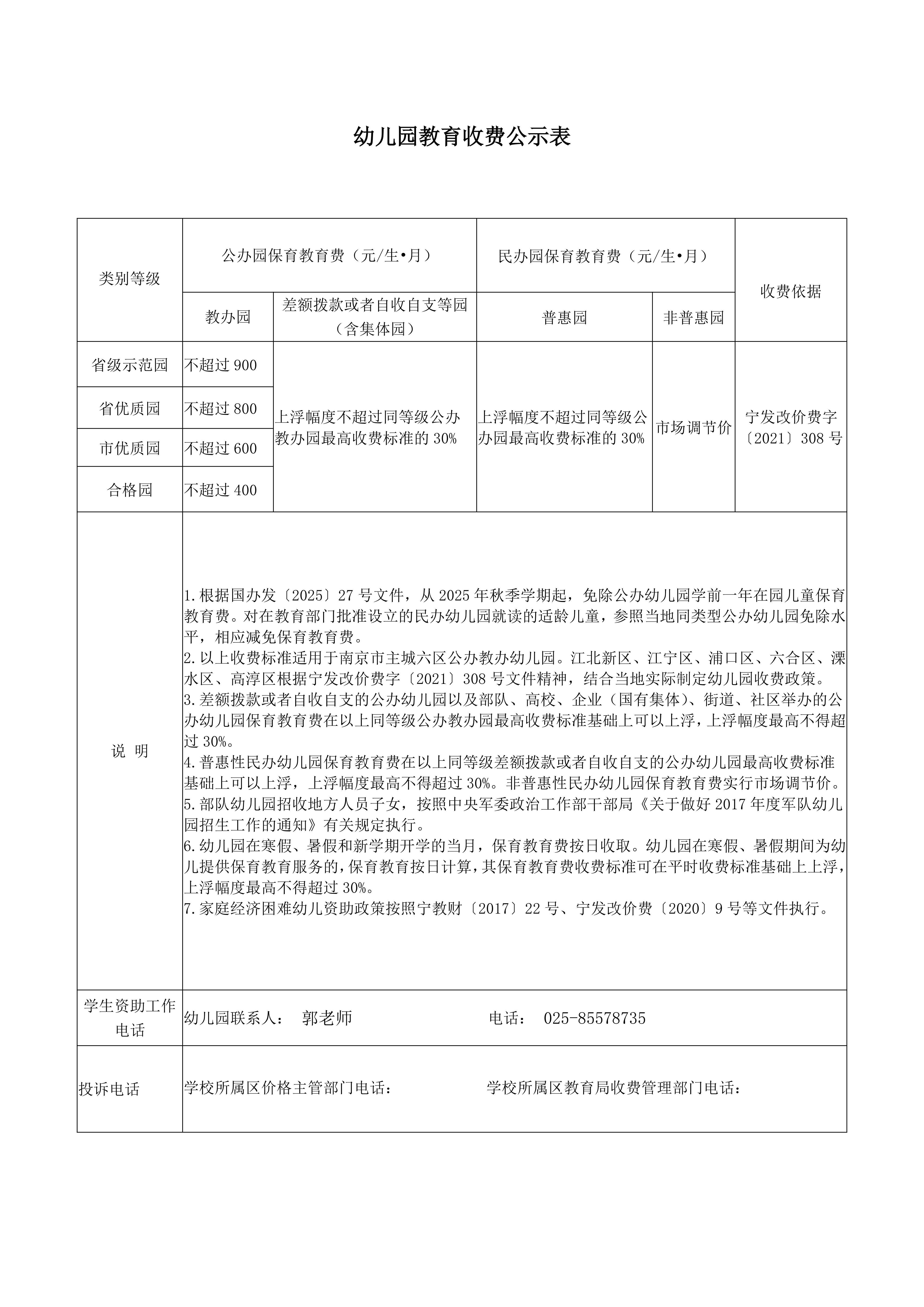 您好!为贯彻落实《江苏省幼儿园收费管理办法》、《省教育厅办公室关于做好中小学食堂伙食费收缴管理的通知》、《南京市教育局办公室关于做好中小学食堂伙食费收缴管理的通知》(宁教办财函〔2024〕4号)要求,进一步加强幼儿园保教费、食堂伙食费收缴管理,南京市栖霞区西岗幼儿园就收费事宜向您做如下告知,具体请见附件。